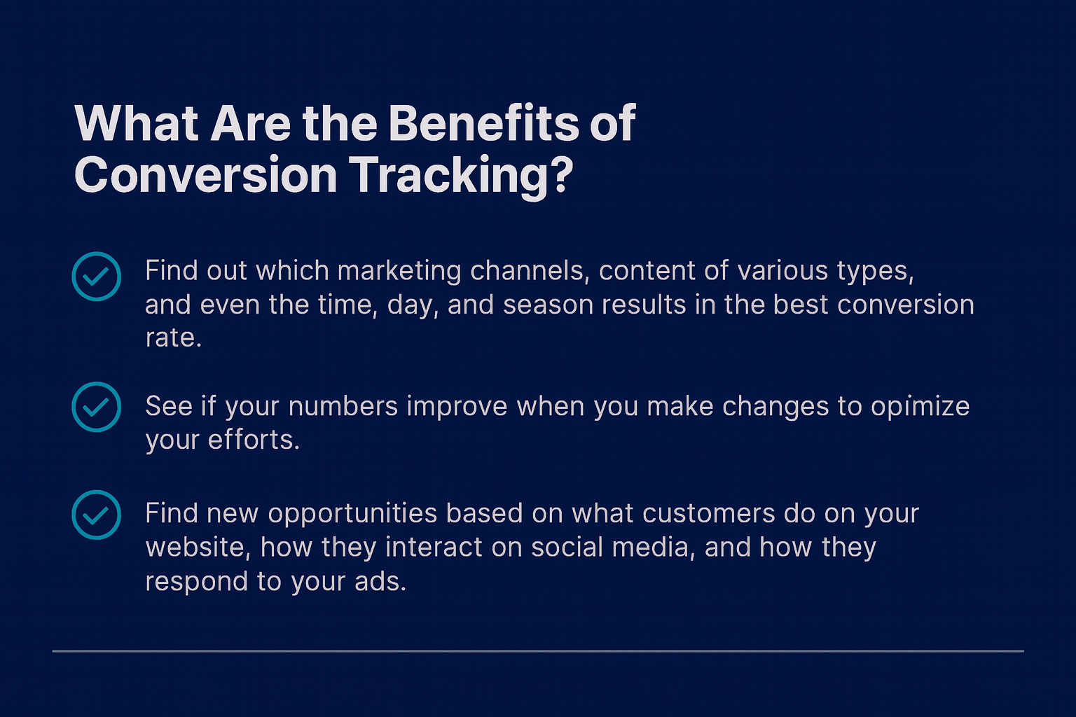 There are numerous benefits to conversion tracking, but the main one is easy: Conversion tracking helps you get better every time you advertise. This conversion data helps you plan for the future so you can optimize your key performance indicators (KPIs). You can also prove to leadership that your ad spends — the amount of money you’re spending on ads — are generating a return on investment (ROI). This helps you justify future ad campaigns to your CFO or CPA.